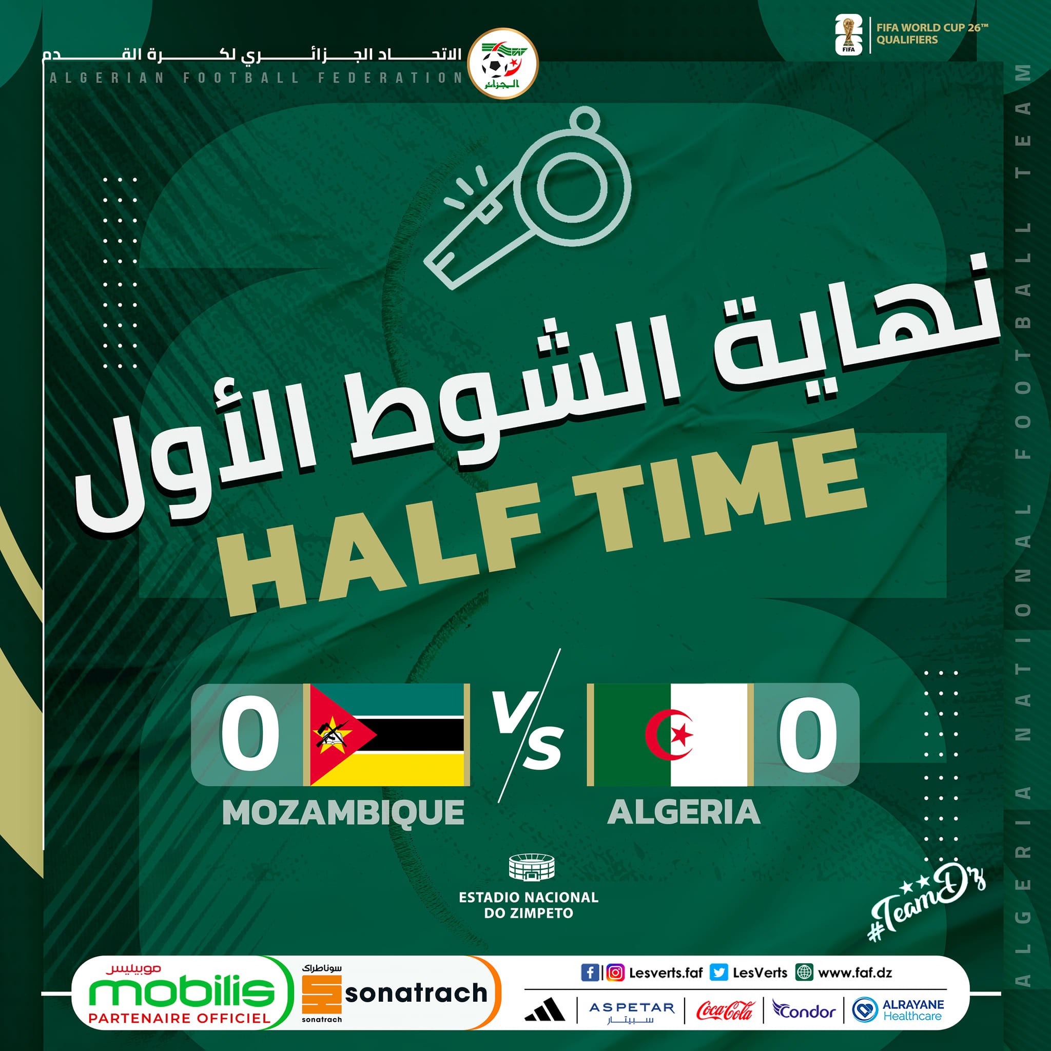 الشوط الأول لم يكن قويا من جانب الخضر، حيث كانت بداية المواجهة قوية من جانب المنتخب الوطني الذي حاصر مرمى الموزمبيق، وشن عدة هجمات مركزة طيلة الدقائق العشر الأولى.