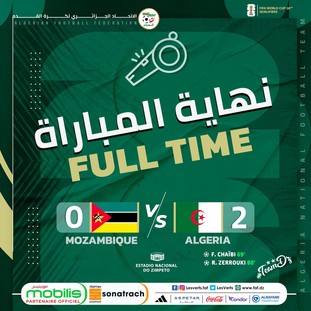 نجح المنتخب الوطني في العودة بالنقاط الثلاث من سفريته إلى الموزمبيق، حيث فاز بهدفين دون رد، في الجولة الثانية لتصفيات كأس العالم 2026، التي جرت اليوم بملعب دو زيمبيتو بالعاصمة مابوتو. فبعد الفوز الذي حققه كلا الفريقين في الجولة الماضية، كانت هذه المواجهة فاصلة لصدارة المجموعة السابعة. بداية المواجهة كانت قوية من جانب المنتخب الوطني […]...